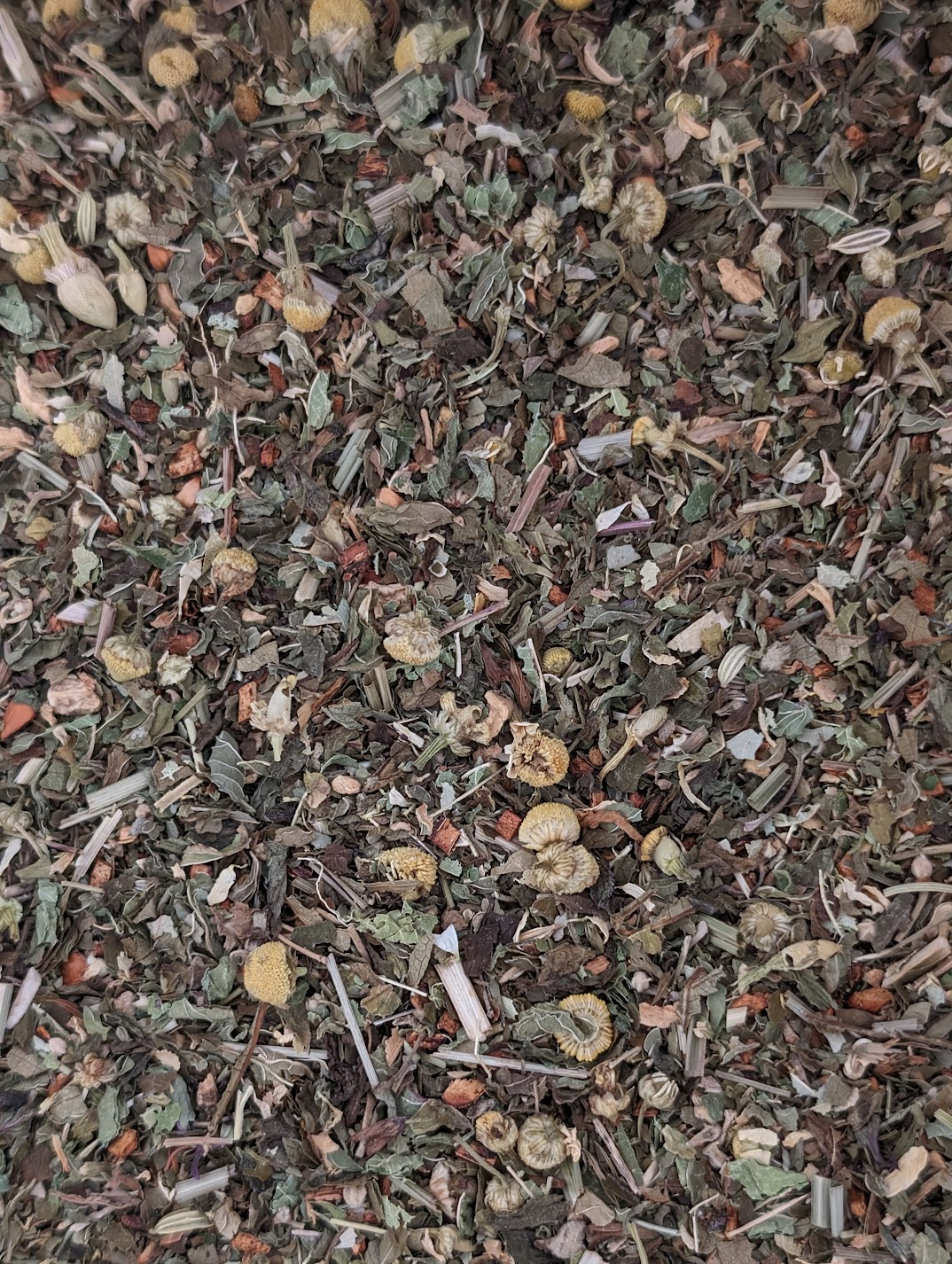 Blend of sweet mint, chamomile, lime blossom, Rooibos, mulberry leaves, fennel, lemon balm leaves, ginger, lemon verbena leaves, rosehip with orange flavor
