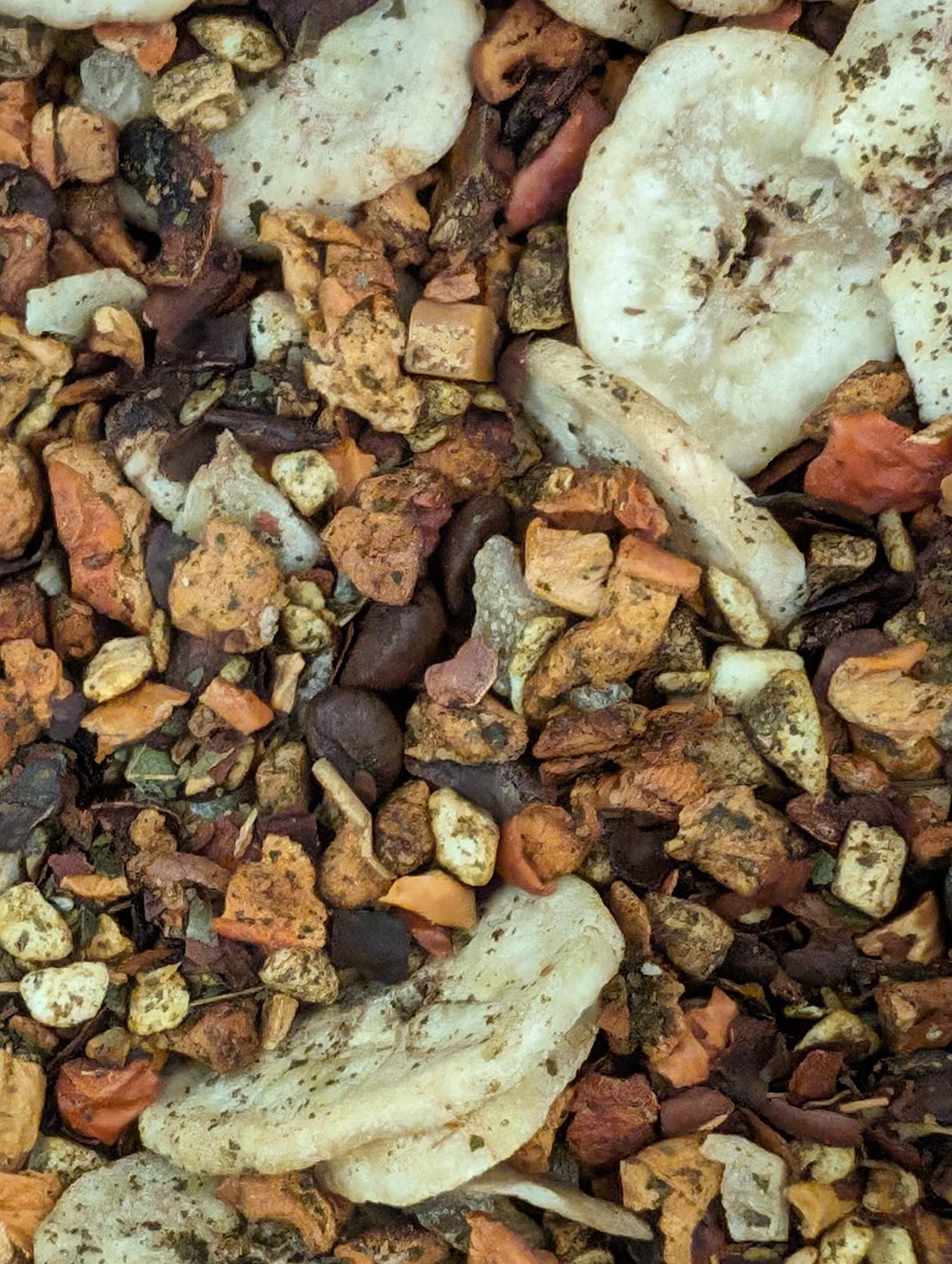 Large banana slices, white yogurt granules and aromatic coffee beans.