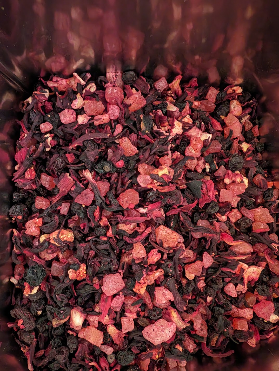 Rosehip peel, blueberries, grapes, strawberries, raspberries, papaya, redcurrants and rose petals. Succulent hot or cold.