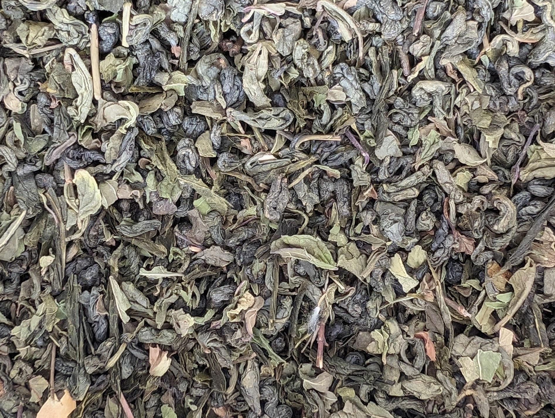 Mélange de thé vert Sencha et de Gunpowder aromatisé à la menthe Nanah du Maroc et à la rose.