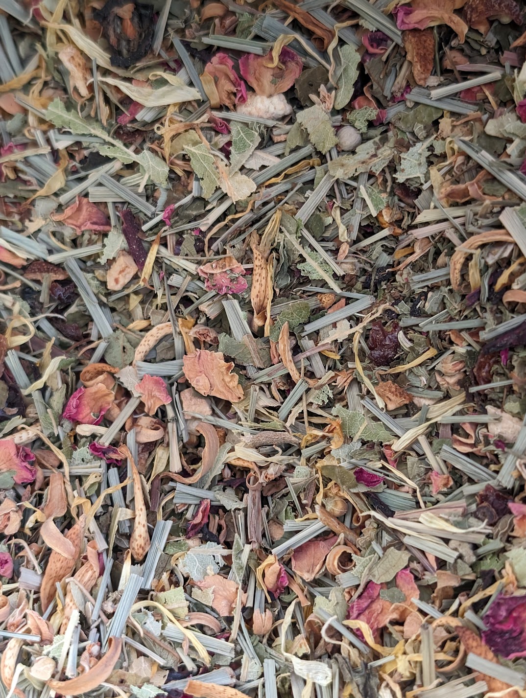 Lemongrass, mulberry flowers, mint, rose petals, hibiscus, lemon and orange peels, fennel.