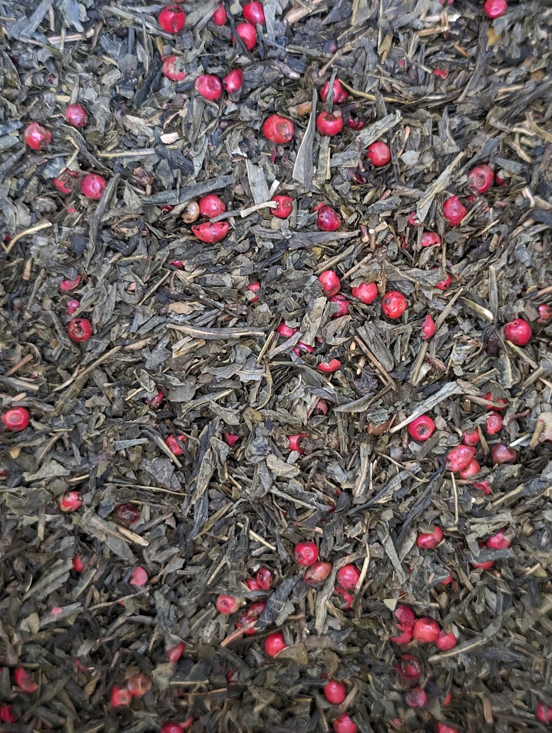 The vert Sencha parsemé de poivre rose Arômes de fraise et champagne