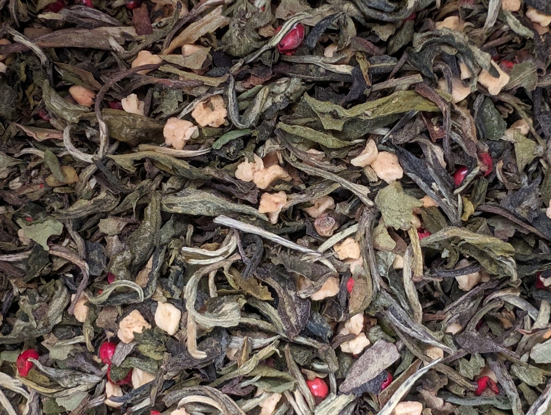 White tea flavored with cinnamon, apple, orange and almond, sprinkled with pink berries. A treat all in white like the magic of Christmas…