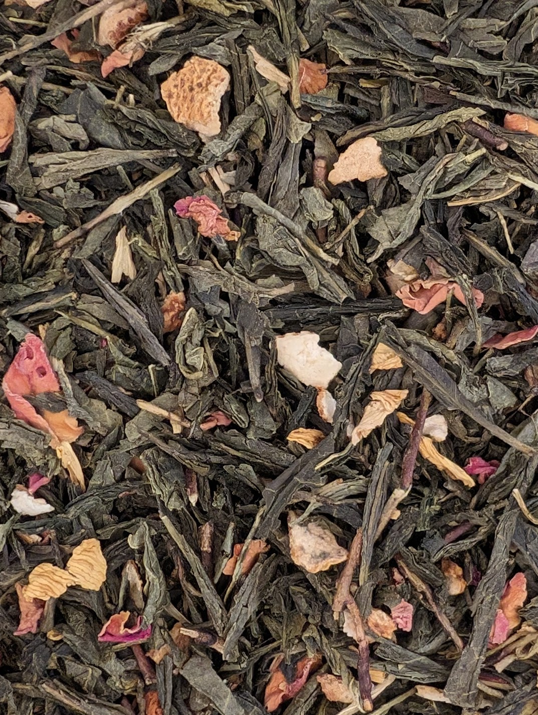 Mélange de Sencha de chine, aromatisé de morceaux de pamplemousse et de fraise, joliment décoré de pétales de roses.